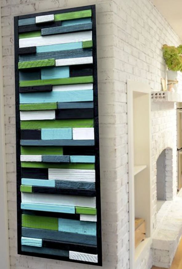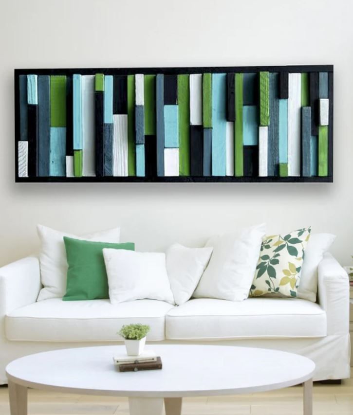 This turquoise wood mosaic is handcrafted using recycled pine tree. Each piece of wood is hand selected to draw out the colorful contrast and beauty of the wood panel.