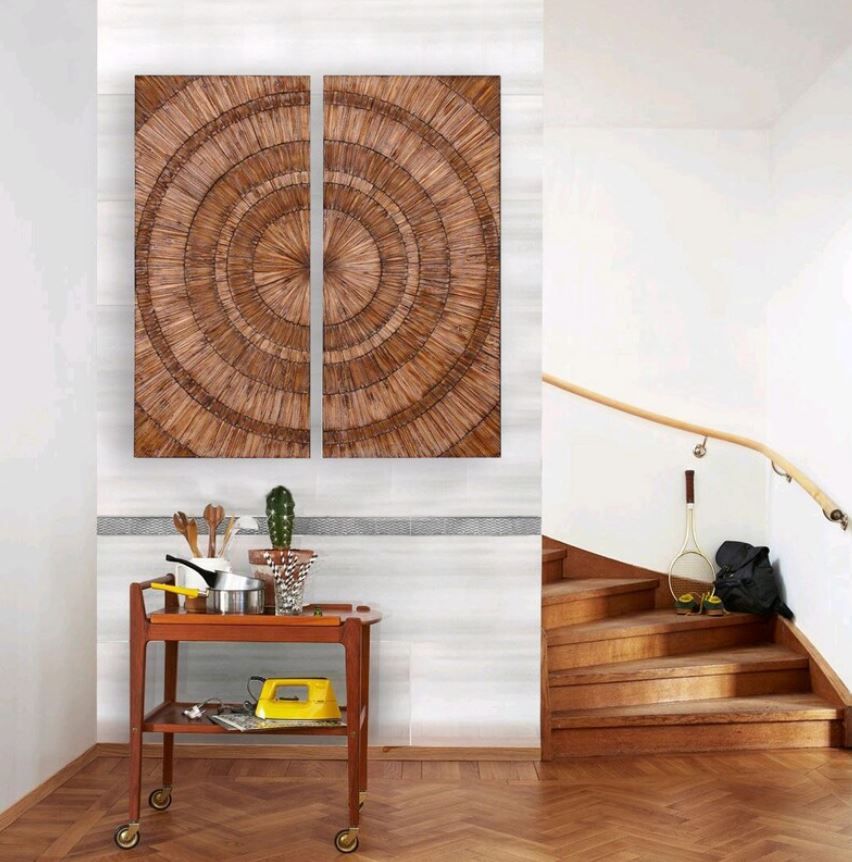 This wood panel is handcrafted using recycled pine tree. Each piece of wood is hand selected to draw out the colorful contrast and beauty of the wood panel.
