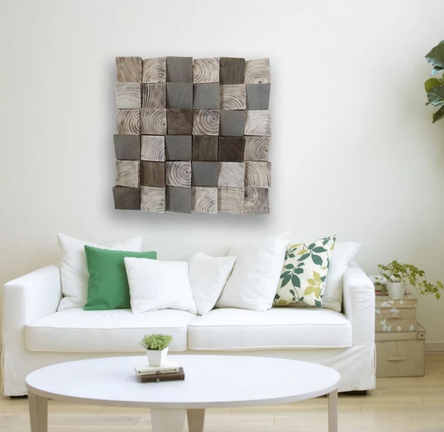 This wood panel is handcrafted using recycled pine tree. Each piece of wood is hand selected to draw out the colorful contrast and beauty of the wood panel.